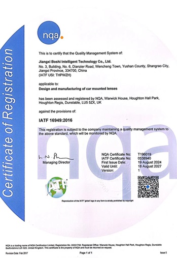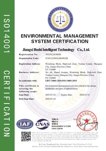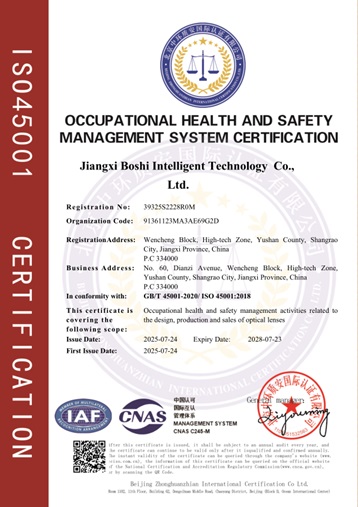 Esto significa que Baoshi Intelligence ha establecido un sistema de gestión estandarizado que cubre toda la cadena de investigación y desarrollo, fabricación, ventas y servicios posventa de lentes ópticas, sentando una base sólida para el suministro continuo de productos y servicios de alta calidad.